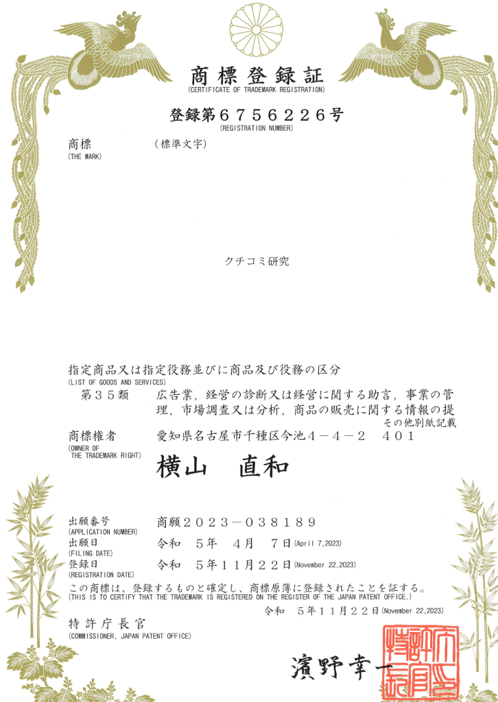 【商標登録証】 登録第 6756226号 / 商標(標準文字)クチコミ研究 区分:第35類(広告業、経営診断、市場調査など)、第41類(映像提供、教育ビデオ制作など) 商標権者:横山 直和 / 登録日:令和5年11月22日