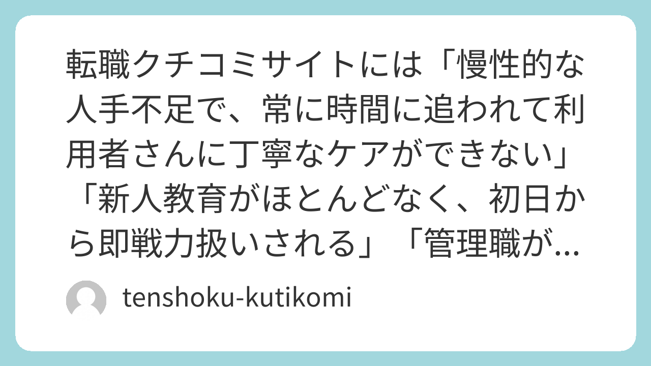悪いクチコミを書かれないためには、求人広告の段階で「誠実さ」を徹底することが大切だと思います。よくある「アットホームな職場」「残業ほぼなし」といった曖昧な表現ではなく、実際の働き方を具体的に示すことが重要です。例えば、「新人は3ヶ月間は先輩が同行します」「夜勤は月◯回まで」「休憩は必ず1時間確保」「記録はタブレットで効率化」など、働く側が安心できる情報を明確に書くことで、入職後のギャップが減ります。また、教育制度やキャリアアップの仕組みを丁寧に説明することで、応募者の不安も軽減できます。さらに、職員の声や実際の働き方を紹介することで、透明性のある求人になります。誇張した表現ではなく、現場の実態を正直に伝えることが、結果的に離職率の低下やクチコミの改善につながると思います。
