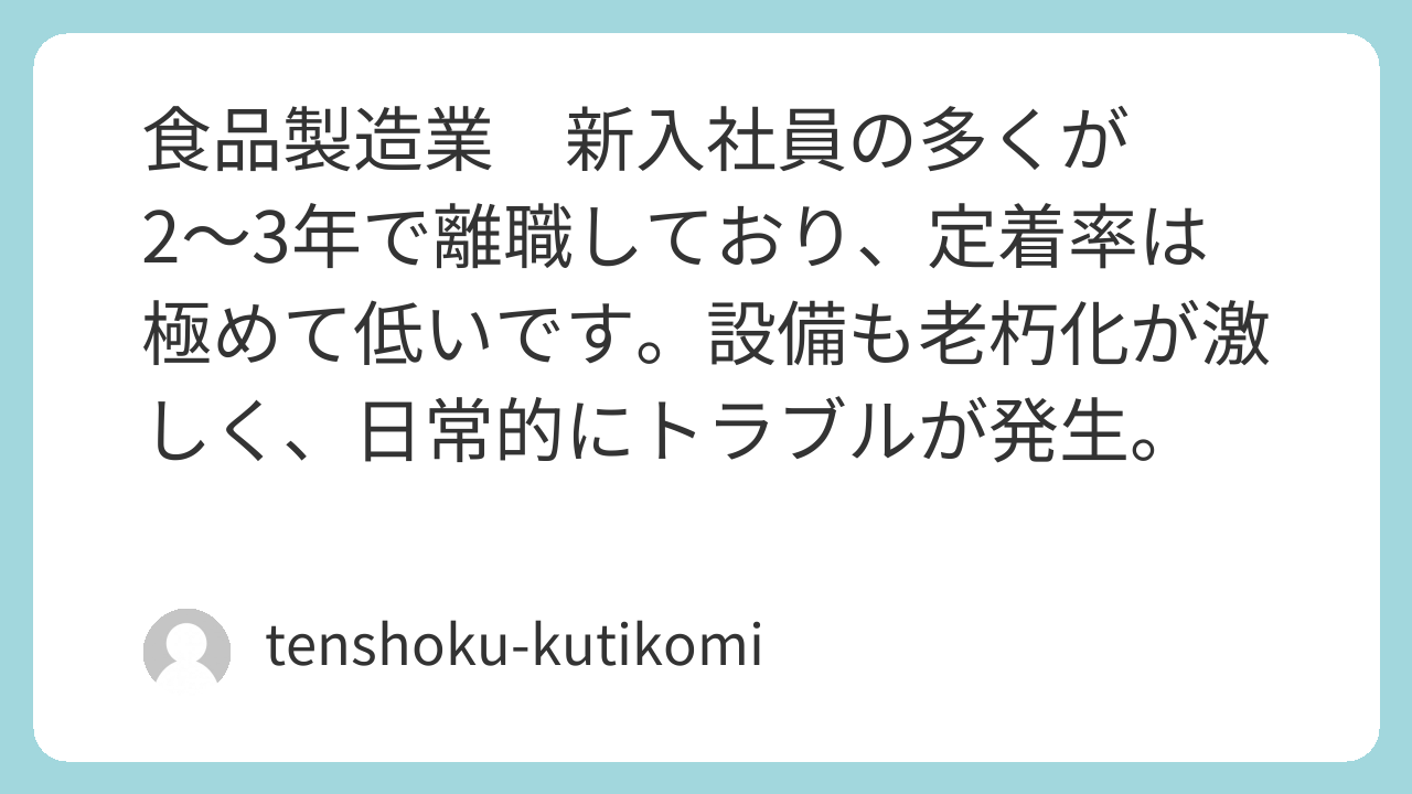 かつて勤務していた食品製造業の現場は、年功序列と古い風習が根強く、部署異動や有給取得にも消極的な風土がありました。現場では男性が主に重作業を担い、女性は補助作業が中心。人員不足のため派遣やアルバイトに頼らざるを得ず、毎日のように新人教育が発生し、業務効率も悪循環に。教育的指導は行きすぎることもあり、感情的に怒鳴られる場面もありました。新入社員の多くが2~3年で離職しており、定着率は極めて低いです。設備も老朽化が激しく、日常的にトラブルが発生するにもかかわらず、改善提案は無視されがちで、壊れるまで使い続ける方針。人間関係は個人プレーが目立ち、勤続年数が長い社員ほど独断専行が強く、上級管理職も指揮力に乏しく統率が取れていません。このような環境ではスキルも身につきにくく、キャリア形成には不向きです。将来を見据えた働き方を望む方にはおすすめできません。