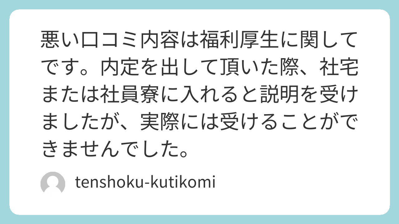 悪い口コミ内容は福利厚生に関してです。内定を出して頂いた際、社宅または社員寮に入れると説明を受けましたが、実際には受けることができませんでした。