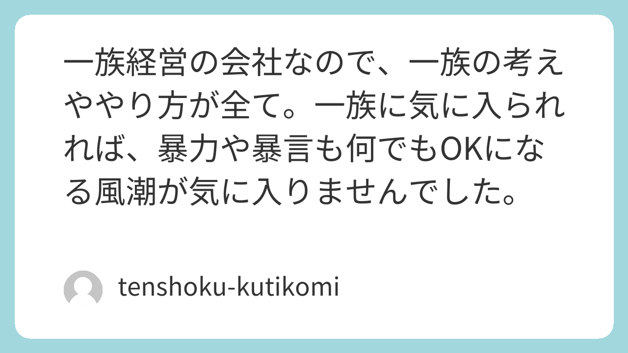 まず一族経営を辞めることだと考えます。理由としては、一族経営だと小さい頃からその状況が当たり前で、会社に雇われる経験をせず崇められながら育つため、一般的な社会人常識を知らずに育った人間が社長となります。明らかに感覚がズレていき、自分を崇める人間のみを周りに置くようになるため、従業員の気持ちを考えられなくなるからです。私のように、暴力や暴言を吐かれる日常がなくなれば、最低限悪い口コミはされなくなると思うので、経営を健全化することが大事かと考えます。