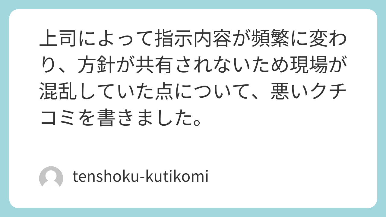 まず、業務量に対して給与が低く、残業代の支払いも曖昧であった点を指摘しました。また、評価制度が不透明で努力や成果が給与や昇進に反映されにくく、モチベーションが維持しづらいことも書きました。さらに、人間関係が希薄で情報共有が不足しており、上司の指示も場当たり的で業務効率が悪い点についても触れました。加えて、経営方針が頻繁に変わり現場に混乱を招くことや、社員の意見が反映されにくい組織文化も問題点として挙げました。これらを総合して、転職希望者には十分な情報として参考になるよう率直に投稿しました。