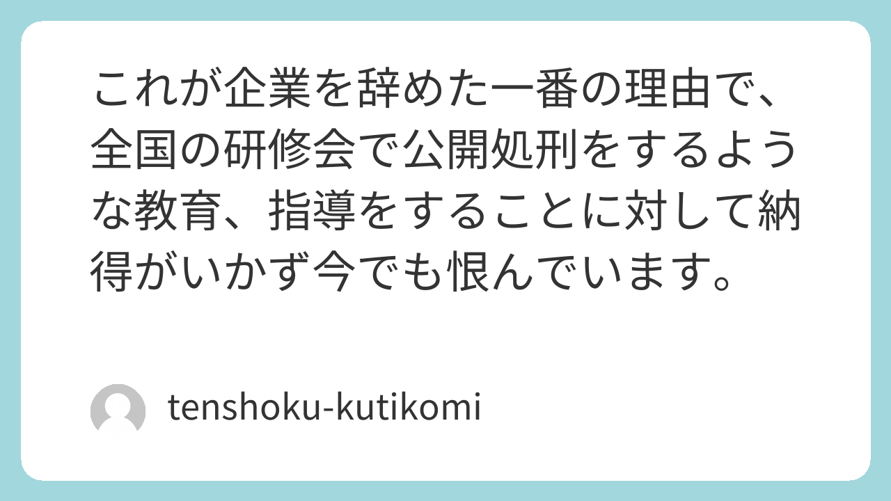 また、上層部の思いつきでシステムが頻繁に変わるものの、現場への説明が不足しており、混乱を招くだけの結果になっています。有給休暇も形骸化しており、周囲の目を気にして取得しづらい雰囲気です。スキルアップや独立を支援する制度も一切なく、使い捨てにされている感覚が拭えませんでした。従業員を大切にするという言葉とは裏腹に、実際はコストとしか見ていない体制に絶望し、退職を決意しました。」