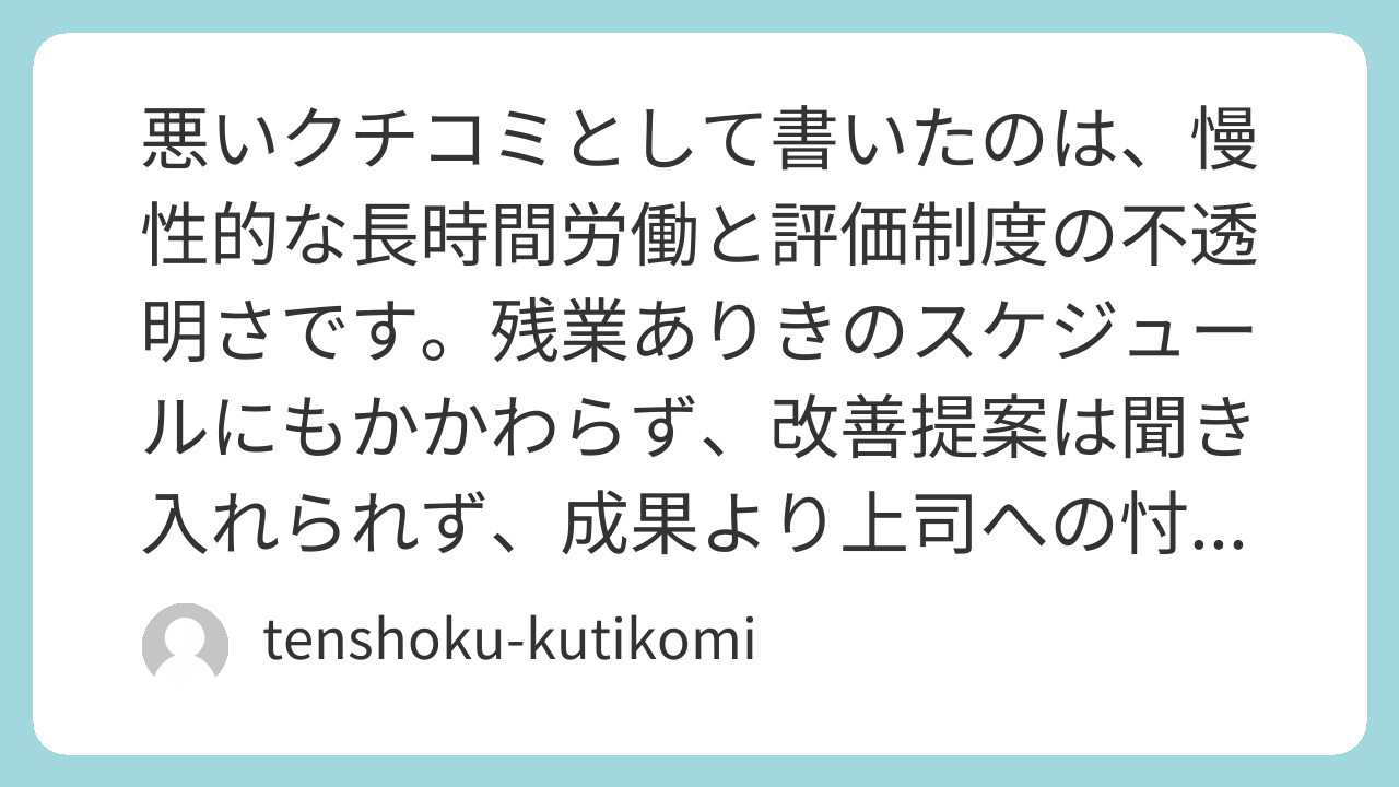 悪いクチコミとして書いたのは、慢性的な長時間労働と評価制度の不透明さです。残業ありきのスケジュールにもかかわらず、改善提案は聞き入れられず、成果より上司への忖度が評価に影響していると感じました。